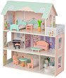 Дървената къща ще бъде прекрасен дом за куклите на вашето дете. Тя разполага с 3 етажа и има тераса. На първия етаж са разположени кухня и баня. Вторият етаж разполага с музикална стая и хол. На третия етаж се намира спалнята. Мебелите, които са включени в комплекта, са столове, кухненска маса, вана, тоалетна, диван, маса, пиано, стол за пиано, легло, нощно шкафче и растение. Къщата е декорирана в прасковен и светлозелен цвят. Децата могат да разиграват ролеви игри като научат куклите си да свирят на пиано или се погрижат за тях като ги приготвят за сън. Дайте им шанс да развият своето въображение и да се забавляват. ... |