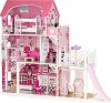 Дървената розова къща ще бъде прекрасен дом за куклите на вашия малчуган. Сградата е изградена на 3 нива. Тя разполага със спалня, хол, кухня, тераса, барбекю зона, баня и външна пързалка. Между първия и вторият етаж има асансьор, а между вторият и третият - извити стълби. Първият етаж има кухня и баня, в които са разположени вана, столчета и маса. На втория етаж е разположен хола, който е обзаведен с диван, масичка, пиано, столче и лампион. Третият етаж представлява спалня, която е обзаведена с двуетажно легло, стълба, кресло, шкафче и лампа. Къщата е декорирана с LED светлини, които осветяват помещенията. Дайте шанс ... |