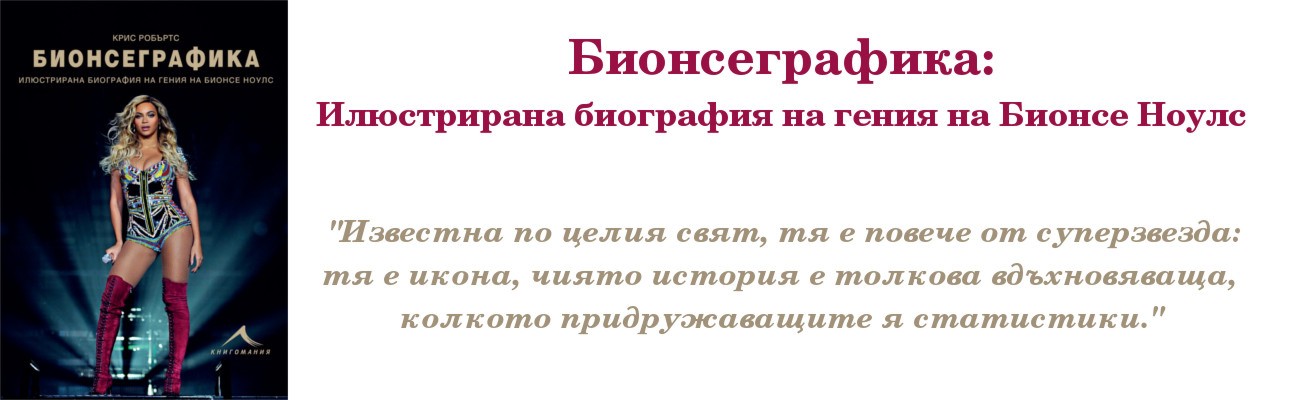 В случай, че дори малко сте се затруднили да я разпознаете, то значи е време да научите повече за живота и кариерата ѝ. Къде е родена и в какво семейство? Как става известна и по чия идея се заражда групата "Destiny's Child"? Отговори на тези въпроси, но и много други интересни факти за живота на Бионсе ще може да прочетете в биографията ѝ. "Бионсеграфика" ще бъде налична и за българските ѝ почитатели съвсем скоро, а нейн разпространител се очаква да бъде издателство "Книгомания".