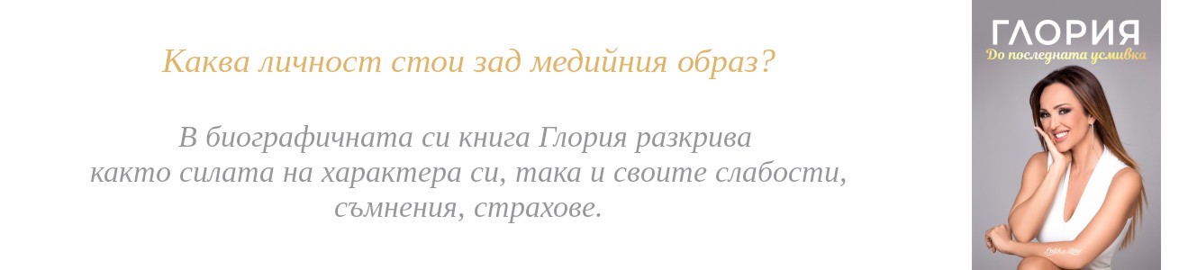 На книжния пазар предстои да излезе автобиографията на Глория под заглавието "До последната усмивка". Книгата носи логото на издателство "Catch a Story", а излизането ѝ от печат се очаква да стане около средата на месец декември. Въпреки това можете да я заявите предварително от store.bg и да я получите когато вече е налична.