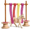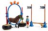 Комплектът е част от серията "Животните от фермата" на "Schleich". ... Едно от препятствията по време на състезанието с понита е преминаването през веещите се цветни ленти, от които повечето понита се страхуват и отказват да продължат. Ако искате вашето пони да победи в това състезание му дайте достатъчно време да свикне с тях като ги подуши и "опознае". Бъдете много търпеливи, защото преминаването през завесата от цветни ленти е най-важното упражнение за преодоляване на плашливостта. Всички компоненти в комплекта са пресъздадени с усет към детайла, в малки размери и ръчно оцветени в красиви ... |