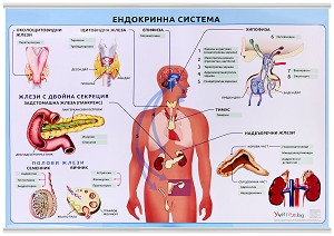 Табло по анатомия описващо жлезите с вътрешна секреция на човека. Постоянството във вътрешната течна среда на организма се осигурява чрез съгласуваното действие на нервна и ендокринна система.