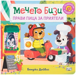 "Мечето Бизи днес работи в пицария - ресторант за пици. Първо приготвя продуктите. Бизи реже зеленчуците за пицата. Най-важни са доматите."
