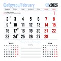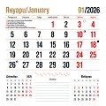 Характеристики на календара: 3 тела от 12 листа - на всеки лист по 1 месец (основен, предходен и предстоящ месец); фази на луната; имени дни; църковни празници; официални празници; съкращения на държавите, които честват свой празник на дадената дата; прозорче с ластици. ... |