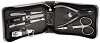 Стилен несесер с козметични инструменти от черна кожа (имитация на крокодилска) с метална рамка и сребриста закочалка. Отвътре несесерът е подплатен с черен плюш, а инструментите, които включва са: две ножички за изрязване на нокти и кожички, инструмент за премахване на комедони, нокторезачка с изваждаща се пиличка, права пинсета за отстраняване на косъмчета, инструмент за почистване на кожичките от нокетната плочка, метална двустранна пиличка и клещички за рязане на кожички. Несесерът е компактен и подходящ за всякакви размери дамски чанти. Той пристига в подаръчна кутия, подплатена със сатен. Всеки продукт с марката “ ... |