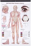 Таблото представя акупунктурните точки по човешкото тяло: по цялото тяло; в областта на главата и врата; по окото; по ръката; по външната и вътрешната страна на стъпалото. Показани са: меридианен часовник; анатомичната структура на акупунктурна точка (по Хайне); отличителна мерна единица - цун; таблица с основните меридиани и акупунктурни точки таблица с основните и второстепенни меридиани и тяхната връзка. Таблото е с размери 47.8 х 68 cm, изработено е от плътна гланцова хартия и има лайсна в горната си част с дупка за закачане на стената. ... |