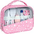 Бебешкият комплект на "Jane" съдържа всички важни тоалетни принадлежности необходими на вашето бебе, още от самото му раждане. В него са включени малка ножичка със заоблени върхове, нокторезачка, 4 еднократни пилички, термометър за баня, четка за зъби, гребен и четка за коса с мек изкуствен косъм, който нежно ще масажира скалпа на вашето бебе. Всичко това се съхранява в практичен несесер с цип, който е изключително удобен за съхранение и пренасяне по време на пътуване. Почистване: Можете да почиствате отделните части на комплекта с топла вода и сапун, а несесера може да се пере на ръка, при температура до 30° ... |