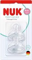 Биберонът на NUK е произведен от силикон и е подходящ за бебета от 6 до 18 месеца. Той е с поток на течността Flow Control, което означава, че бебето само контролира потока на течността, независимо дали иска да пие бързо или бавно и дали храната е течна или гъста. Биберонът е с широка основа и специална форма, която допринася за приликата му с майчина гърда и създава естествено усещане за вашето дете. Той е с дизайн, който помага на бебето да възпроизвежда естествените движения при сучене, стимулира движението на устата и езика, и се адаптира към устната и небцето на бебето. Биберонът е подходящ за всички шишета за ... |