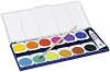 Комплект от 12 цвята акварелни боички с отлична покривна способност. Към тях са включени още четка и тубичка с бяла боя (за да не се зацапва с другите цветове). Всички цветове са в отделни контейнерчета, които могат да се махат, а капакът на кутията служи за смесване на цветовете. Боичките отговарят на стандарта за безопасност на детските играчки - DIN EN 71. ... |