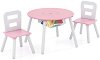 Комплектът на Costway се състои от 2 столчета и масичка, които са чудесно допълнение към всяка детска стая. Масата има гладък плот с отвор в средата, където е предвидено място за съхранение на материали за рисуване или дребни играчки. Столовете имат удобни облегалки и седалки. Размерите на мебелите са съобразени, така че да са удобни за използване от деца от 3 до 7-годишна възраст. Те са изработени от MDF плоскости и са със стабилни крачета от масивна дървесина. Проектирани са със заоблени ръбове и покритие, което е лесно за почистването. Характеристики: място за съхранение под плота на масата размери на масата: ... |