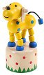Жълто куче, я се виж! Ту наляво, ту надясно – май ще ти е много тясно? Смешни пози все си правиш, ритъма да не забравиш? Куче да танцува, вместо да спи и да прави купища бели? Е, кучето на "Woodyland" танцува, прави пируети, впечатлява и не спира да се забавлява. В какво се крие тайната на тези чудеса? Ето я и нея: забавното животинче всъщност е фигурка, изработена от малки дървени елементи, нанизани на въженца. Всяко въженце е свързано към дървен бутон на пружина, който е скрит в долната част на стойката на играчката. При натискане на бутона в някоя посока, съответното въженце се отпуска и кученцето бързо ...
