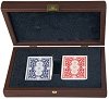 Картите за игра на италианската фирма "Modiano" се открояват по своя стил и качество и са изключително издръжливи за игра. Те са изработени от пластифициран картон и издържат много повече от обикновените хартиени карти. Те са в комплект с луксозна дървена кутия, облицована отвътре с мек плат, наподобяващ кадифе, а магнити държат капака затворен. Цветът на кутията е тъмно кафяв с изключителен гланцов завършек. Размери на кутията: 17.5 / 12 / 4.7 cm. Може да направите комплект с чипове за покер - Las Vegas. ... |