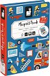 Образователният комплект е част от серията Magneti'Book, където ще откриете още интересни продукти по темата. ... Образователният комплект от Janod е във формата на книга и съдържа 52 магнитни елемента и 18 карти с различни изображения на космически машини. След като детето избере карта с илюстрация, трябва да се опита да я пресъздаде върху фона. Освен това има свободата да съчетава магнитните елементи, следвайки въображението си. Така ще се получат интересни съчетания на измислени предмети и сюжети, с които да се забавлява. Играта с комплекта ще развие концентрацията, въображението и фината моторика на децата. ...
