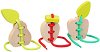 Комплектът за нанизване от "Cubik" е подходящ за деца над 3 годишна възраст. Той се състои от 6 дървени елемента под формата на круша, ябълка и ягода, 3 листа и 3 връзки за нанизване. С него малчуганите ще могат да развият своята фина моторика, логика и координация, докато промушват връзките през отворите на плодчетата. ... |