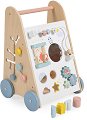 Първите стъпки са важни, затова дървената проходилка от Janod ще бъде пръв приятел на вашето дете. Тя има 4 колелца с гумен пръстен, който ги прави безшумни. Количката съдържа 30 кубчета с букви и цифри, които спомагат за научаване на нови знания, усет за форма и разпознаване на цветове. Детето може да си играе или да решава сложни математически уравнения със сметалото, което е разположено в предната част на проходилката. Дизайнът с венчелистчета ще радва малките деца, докато те прохождат. Уокърът спомага за развитието на двигателните умения на малкия човек. Дървеният уокър е с размери 43.5 / 35 / 41 cm. ... |