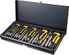 Комплектът на Topmaster Professional включва накрайници, метчици и вложки в 5-те най-необходими и разпространени метрични размера: M5, M6, M8, M10 и M12. Изработени са от първокласна бързорежеща стомана, а свредлата и винтовите метчици гарантират качество и производителност. Комплектът е идеален за възстановяване на повредени вътрешни резби, както и за извършване на дейности по поддръжката им, за да се предпазят от износване. Предлага се в комплект с удобен куфар за съхранение. ... |