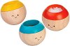 Усмихнати, в различни цветове, за да провокират детския интерес и... крият в себе си интригуващи, но едновременно с това полезни за бебетата изненади - такива са забавните топчета на "PlanToys". 1, 2, 3... завърташ с ръка и всяко топче показва нарисувано усмихнато личице. Това обаче съвсем не са изненадите, полезни за малкото съкровище. Ако погледнеш "топчестите лица" отстрани, като че ли всяко от тях носи цветна "шапчица". Но погледнеш ли някоя "шапка" отгоре, ще видиш и изненадата - всяко от дървените топчета с нарисувани личица има отвор от цветната си страна, където са скрити ... |