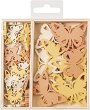 Комплектът за декориране от KPC включва 54 фигурки в дървена кутия с размери 10.5 x 10.5 cm. Фигурките са с форма на пеперуди, оцветени в кремав, жълт и оранжев цвят. Те могат да бъдат използвани в изработването и оформлението на албуми и етикети, в опаковането на подаръци, в изработката на ръчно декорирани табели, плакети, картички, украшения и много други скрапбукинг проекти. Може да декорирате в комбинация с различни материали - акрилни бои, брокати, камъчета, панделки, хартия за декупаж и салфетки за декупаж. Какъвто и метод за декориране да изберете, е препоръчително да запечатате своето произведение на ...