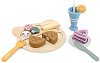 Комплектът е част от серията PolarB, където ще откриете още играчки и аксесоари. ... С комплекта от Viga Toys вашият малчуган ще се почувства като един истински готвач. Той се състои от голяма и малка чиния, вилица, нож, чашка със сламка и портокалово резенче, пържола, зеленчуци, парче торта и пържени картофки. Те са изработени от дърво, боядисани в ярки цветове. Част от елементите се прикрепват един към друг с помощта на велкро ленти. Така когато детето разреже елементите, те ще издадат забавен звук. За максимална безопасност при игра, компонентите са със заоблени ръбове, което предпазва малчугана от нараняване. ... |