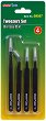 Комплектът е специализиран за работа с дребни елементи, при сглобяване на модели и макети. Той съдържа 4 различни пинцети. Три от тях са със заострен връх, но на едната върхът е извит. Четвъртата пинцета от комплекта е права и с плосък връх. Повърхността на пинцетите, с която се захваща детайла е гладка. По този начин няма да нараним или оставим следи по детайлите. ...