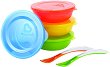 Комплектът на "Munchkin" съдържа 4 броя детски купички за хранене в различни цветове, 4 капачета и 2 лъжички. Купичките са изработени от издръжлива на продължителна употреба пластмаса, а практичните капачета позволяват лесно пренасяне на съдържанието, без опасност от разливане. Лъжичките са с дължина на дръжката, която прави загребването на храната от бурканчето по-лесно. Освен това са безопасни за използване в микровълнова фурна, хладилник и съдомиялна. Продуктът не съдържа Бисфенол А Бисфенол А е химическо съединение, което влиза в състава на различни промишлени пластмаси и смоли. Намира приложение в ...