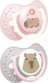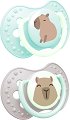 Залъгалките Dynamic CapiChill на Lovi са подходящи за бебета от 6 до 18 месеца, а биберонът им е изработен от мек и нежен към чувствителните бебешки венци силикон. Те са направени по технология, която позволява на биберона да се свива и отпуска по подобие на майчината гърда, за да бъдете вие спокойни, че залъгалката няма да попречи на естествените сукателни рефлекси на бебето. Формата им е съобразена с естественото развитие на небцето и зъбките на бебето. А дизайнът им оставя достатъчно пространство около нослето и брадичката, като по този начин не затрудняват дишането на бебето. Основата на залъгалките разполага с ... |